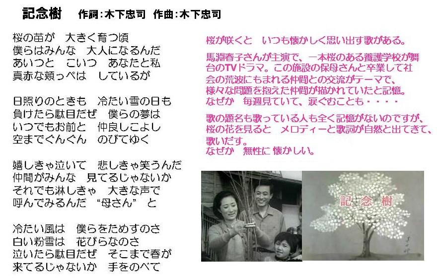 懐かしい私の応援歌 かつてのTVドラマ主題歌 「記念樹」 1405fkobe00b.htm by Mutsu Nakanishi 神戸の一本桜 奥平野の「舞桜」に寄せて 桜を眺めるといつも口づさむ歌 懐かしい私の応援歌 かつてのTVドラマ主題歌 「記念樹」 「桜の苗が大きく育つ頃 僕らはみんな 大人になるんだ・・」