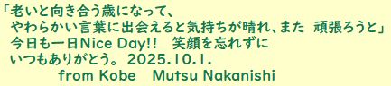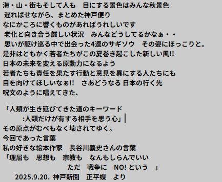 四季折々 神戸便り・思いつくまま・from Kobe 20252025.10.10.更新 < New 掲載記事リスト > < from Kobe 2025 全掲載リスト > mutsu24list.htm by M. Nakanishi 2025.10.10. 四季折々 ・思いつくまま from Kobe 2025 < New 掲載記事リスト >