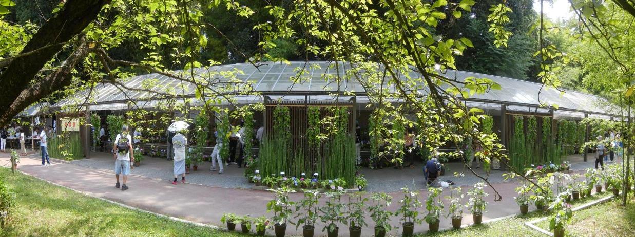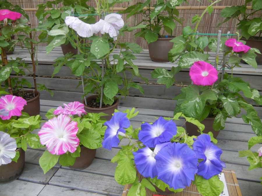 植物園の広い緑に包まれた朝 丹精込めた色とりどりの大輪の朝顔が一堂に会して見事。