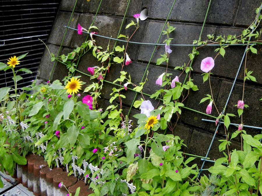 今年はヒマワリの咲くのが遅れ、ヒマワリと朝顔が一緒に 角先で咲きました