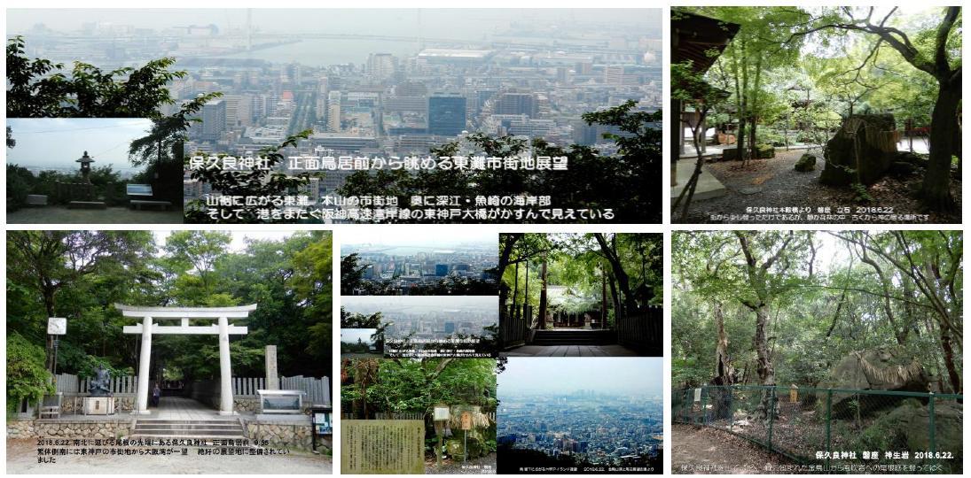住宅街を抜け、少し登ると 眼下に大阪湾を見下ろす尾根筋の先端 緑の林に包まれて鎮座する保久良神社 2018.6.22. 正面鳥居前からは東神戸の市街地から大阪湾が一望できる市民憩いの展望地 かつて神社が焚く篝火が沖行く船の航行の目印であり、境内には幾つも巨岩の磐座があり、神宿る雰囲気が漂う静かな森だ . < 保久良神社鳥居前正面 眼下に広がる神戸東灘市街地の展望 >
