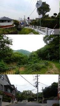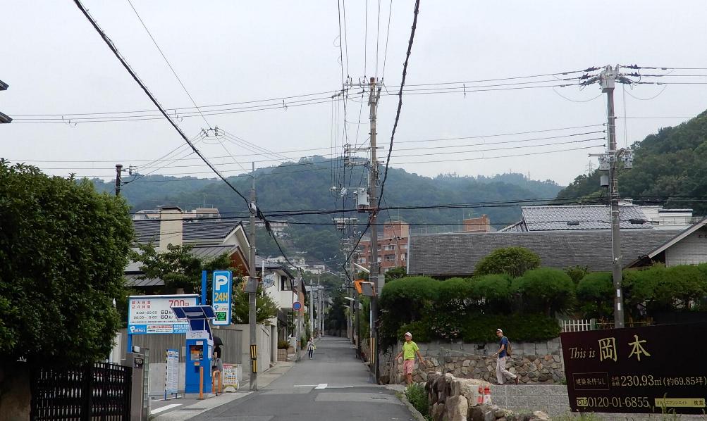 6月22日晴天の朝9時半 阪急岡本駅からまっすぐ北正面にみえる尾根筋へ 住宅街の坂道を上る。この尾根の先端に保久良神社がある